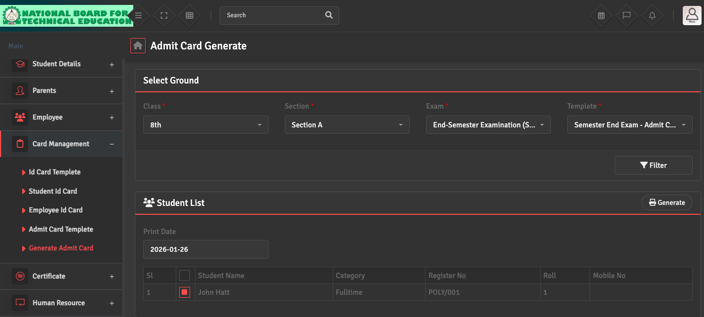 You are using Card Management → Generate Admit Card to select the specific exam and template. If the list is empty, ensure the students' status is Active and are correctly assigned to the Class and Section.