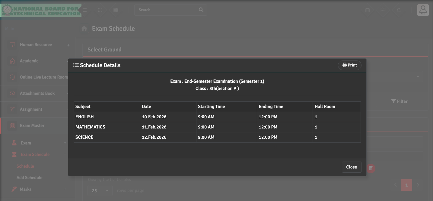 An Exam Schedule has been created for the selected exam via Exam Master → Exam Schedule → Schedule. Click on the Eye icon under Action Section to get the Schedule Details.