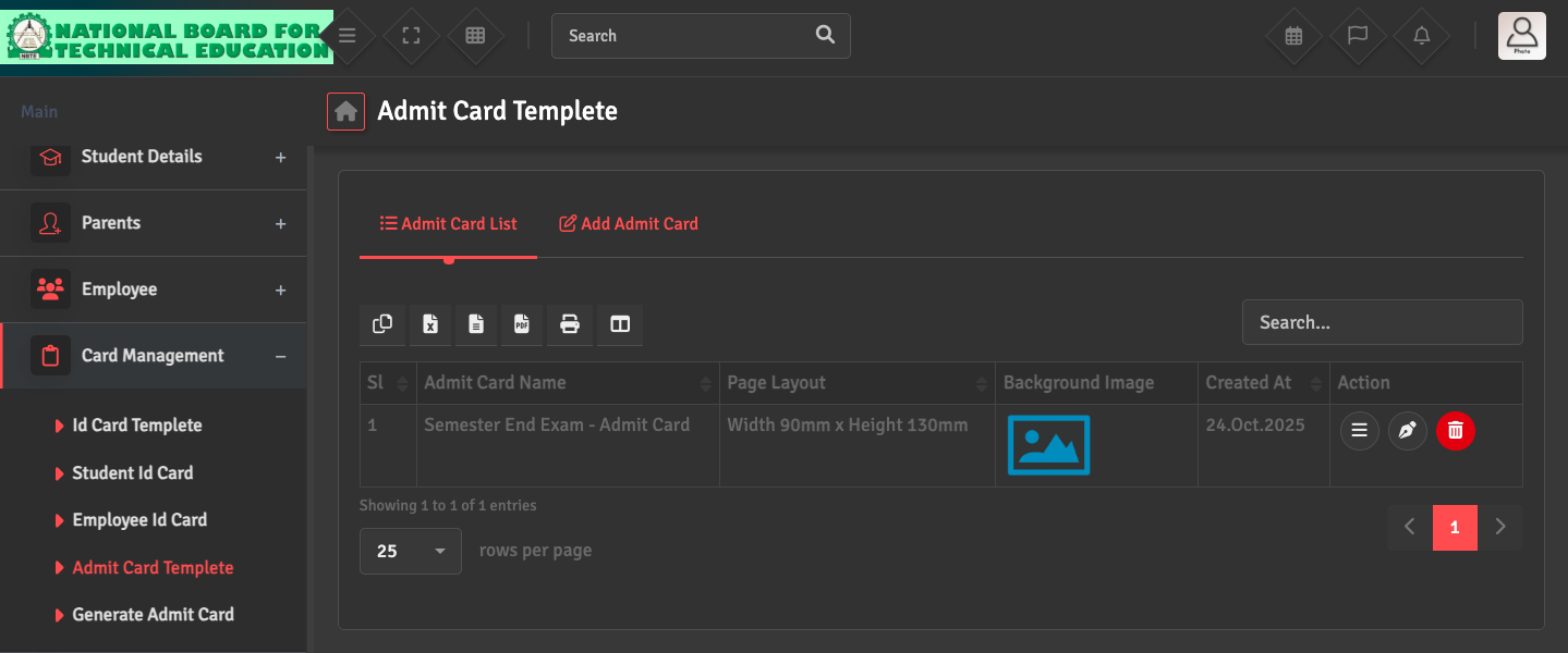 To update the look of your exam hall tickets, go to Card Management → Admit Card Template → Admit Card List. Click on the Pen icon under the Action section. You can customize the header, footer, and instructions for students.