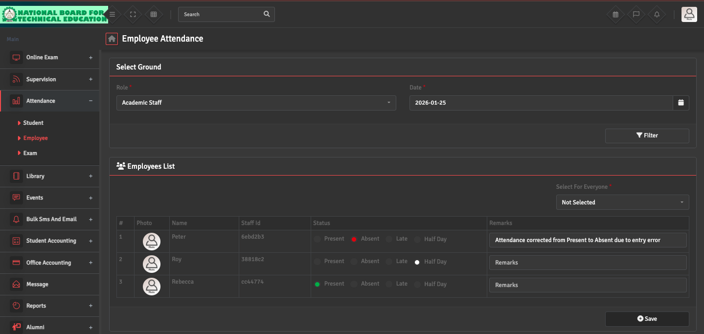 To modify a staff attendance record, go to Attendance → Employee, select the specific date and role, and click 'Filter.' You can manually adjust the status (Present, Late, Absent, or Half Day) for the employee and add a Remark, if needed.