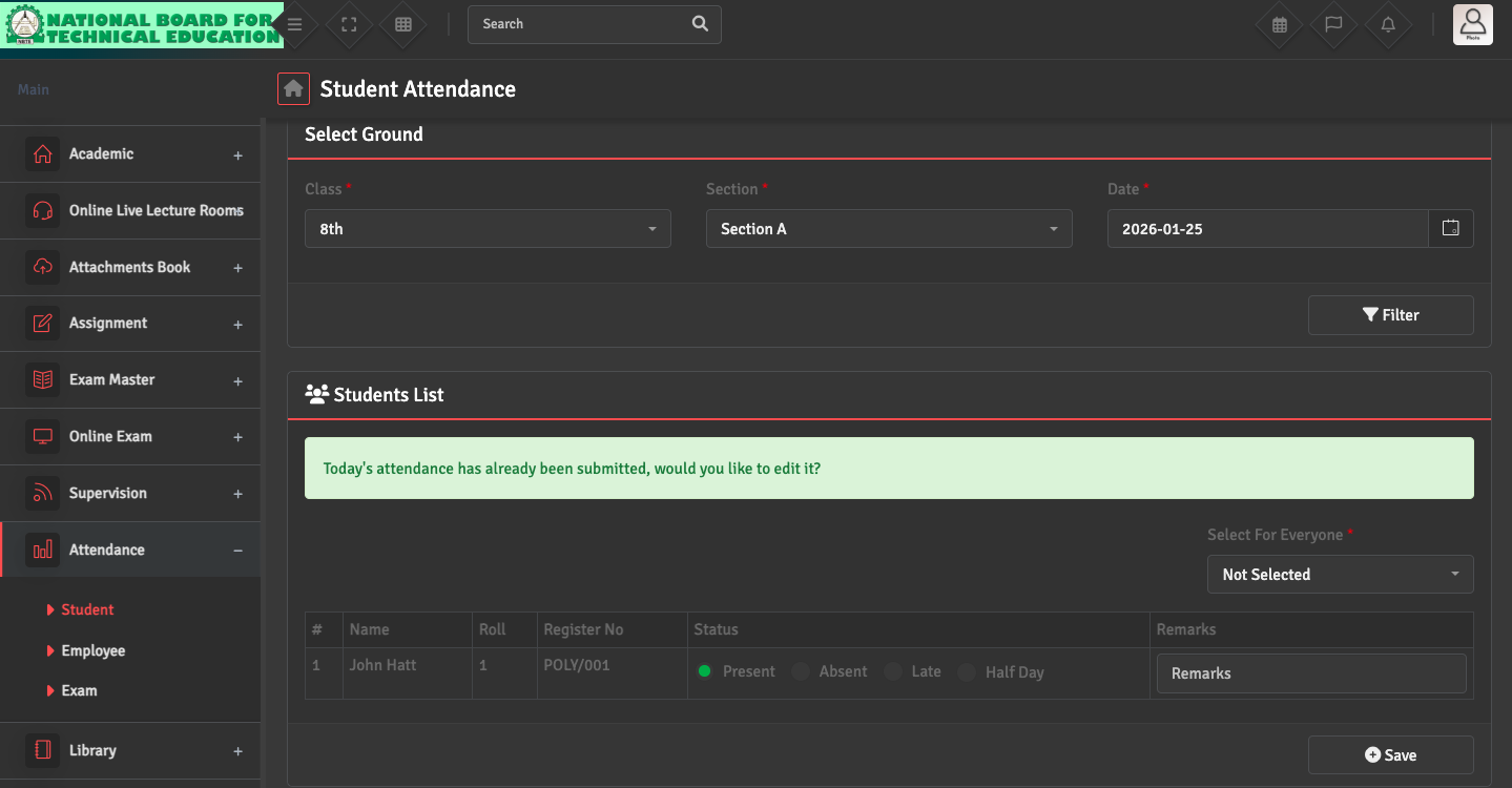 If you are unable to save attendance, please verify that you have selected the correct Date, Class, and Section. Also, ensure that students are officially enrolled in that specific section and the academic session is still active.