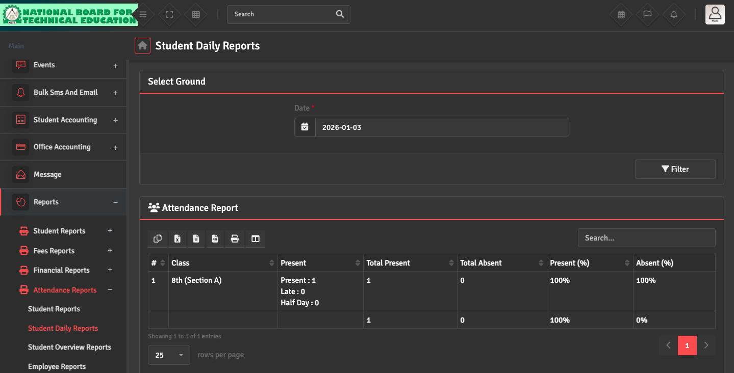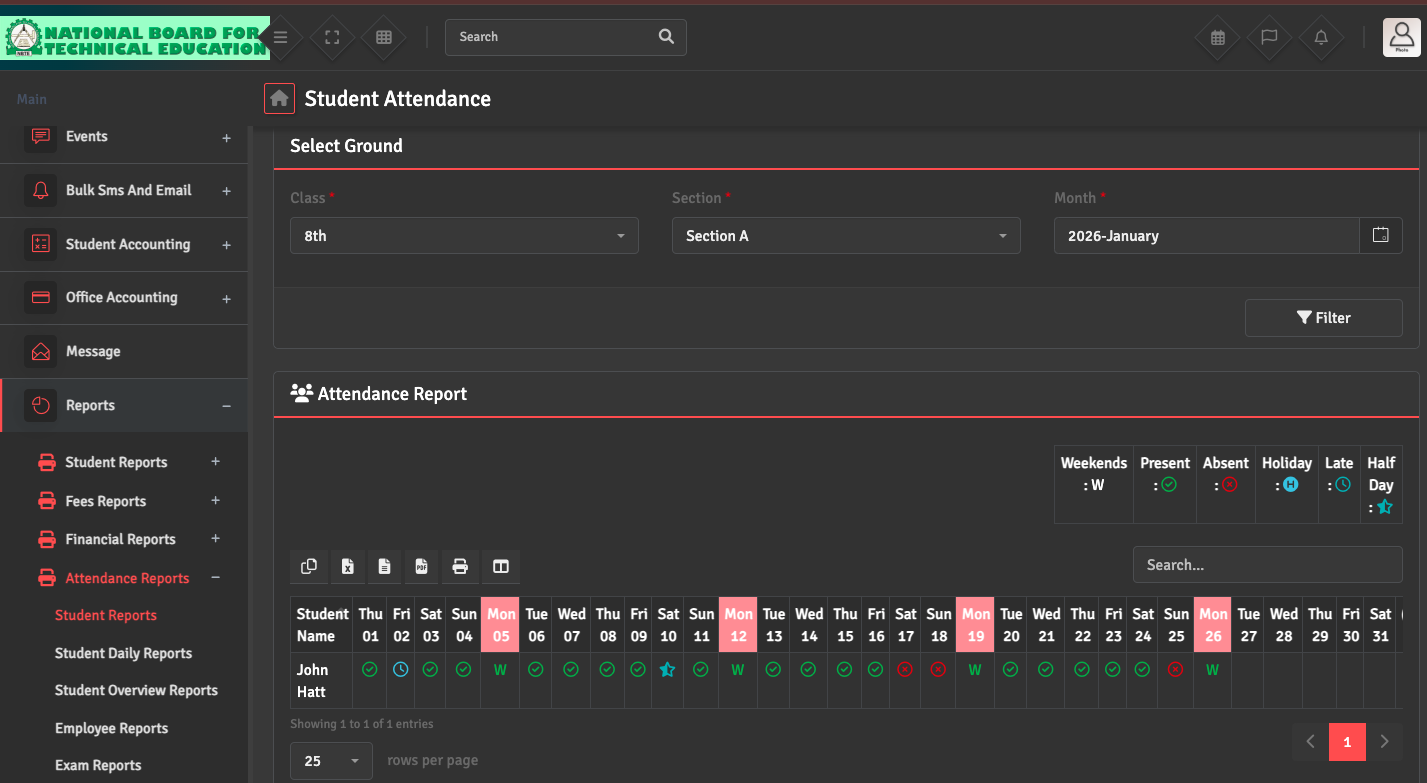 To generate accurate reports, navigate to Reports → Attendance Report → Student Daily Reports and Student Report. You can filter by Class, Section, or Month.