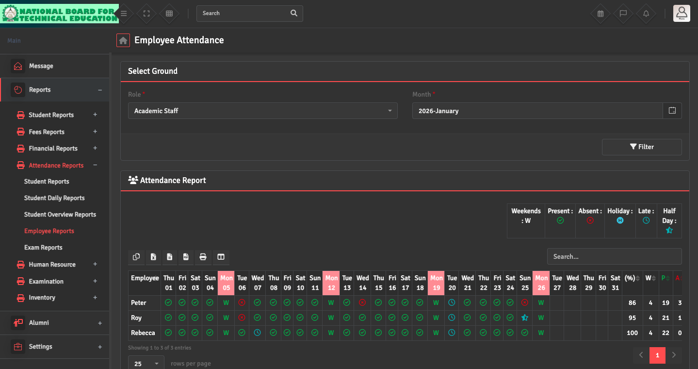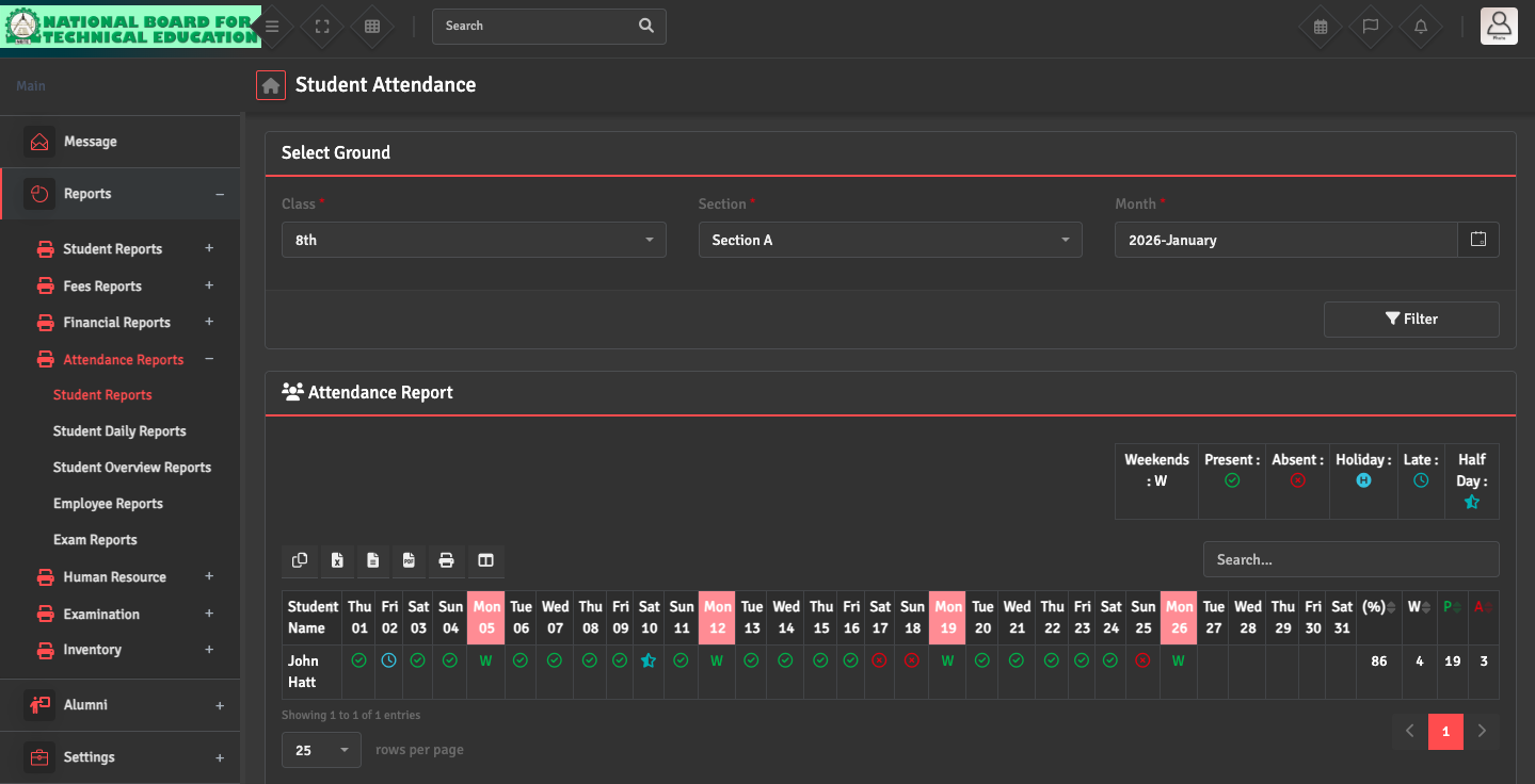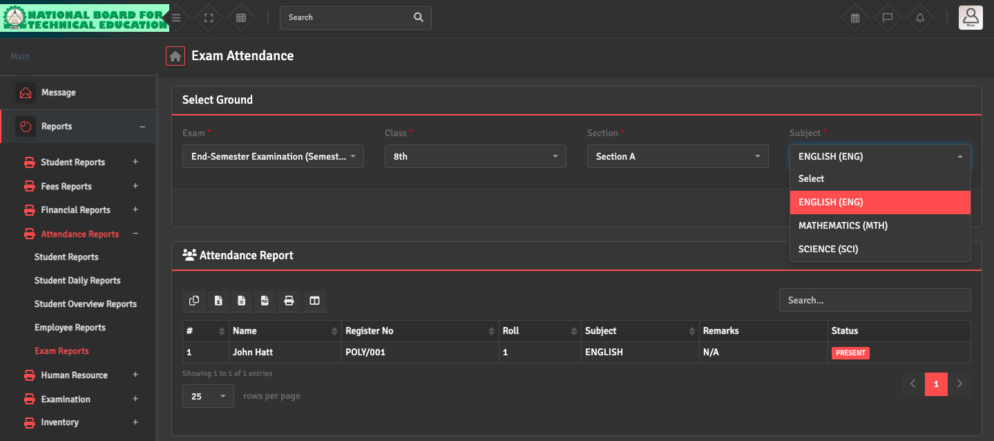 To view or export attendance data, navigate to Reports → Attendance Report. You can generate attendance reports for students, employees and exams.