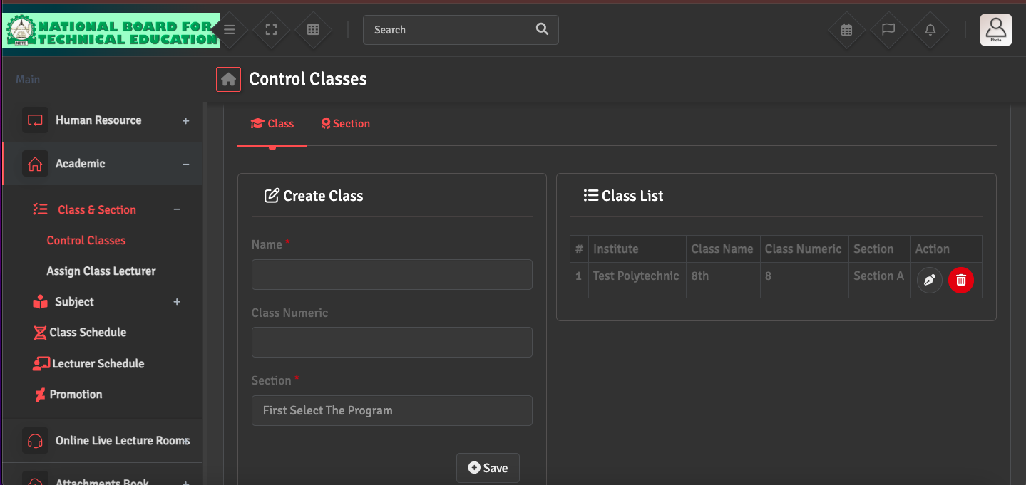 To set up your grade levels, go to Academics → Class and Section → Control Classes → Class. When creating a new class, you will be able to select from the sections you previously created.