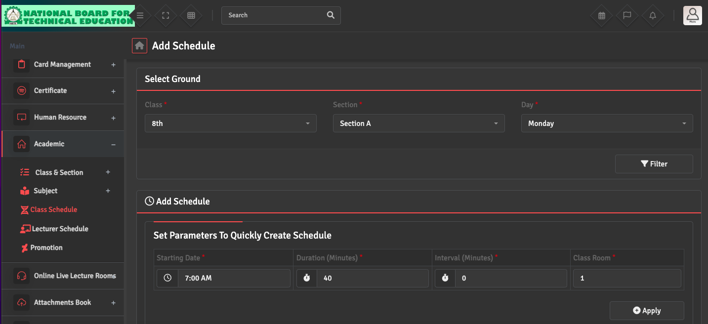 To create a new schedule, please navigate to Academics → Class Schedule → Add Schedule (at the top right). Select the Class and Section, then assign subjects to specific time slots.