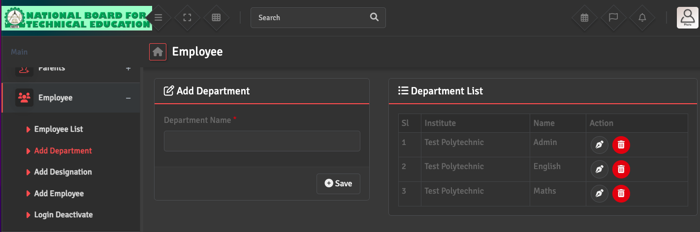 To organize your staff and curriculum by department, please navigate to Employee →Add Department. From this section, you can add new academic departments (e.g., Science, Humanities, or Mathematics).