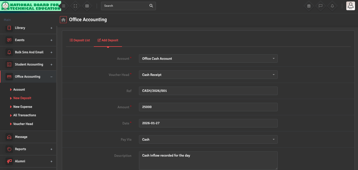 If you are unable to record an income entry, go to Office Accounting → New Deposit → Add Deposit. Ensure that the correct Voucher Head is selected and linked to the appropriate Bank or Cash Account.