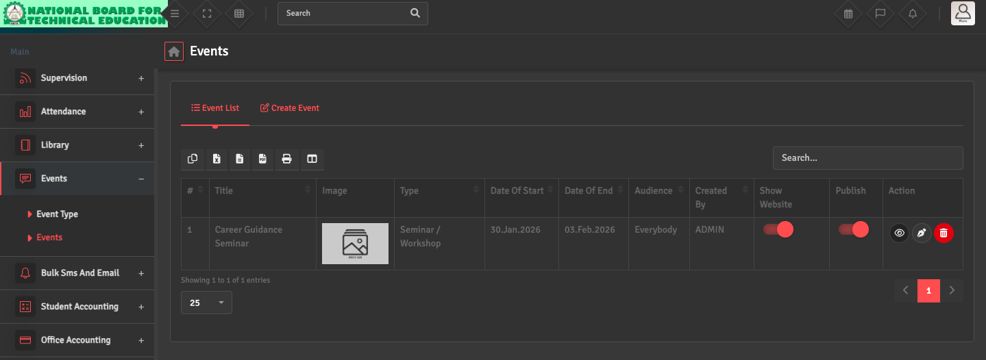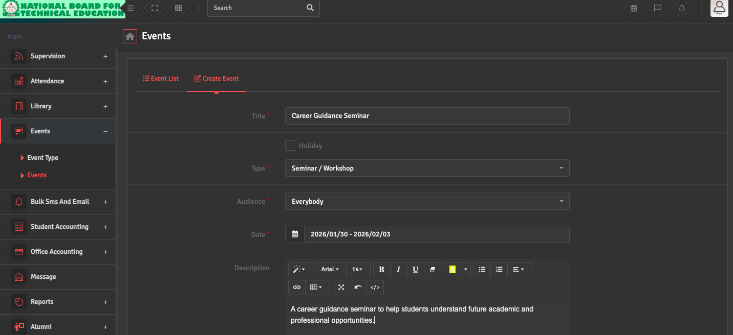 Please navigate to Events → Events → Create Event. Enter the title, select the event type, choose the audience, set the event date range, add a brief description, and upload an image if required.