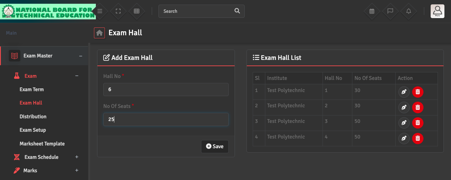 To manage physical seating arrangements, go to Exam Master → Exam → Exam Hall. You can enter the hall number and specify their total seating capacity.
