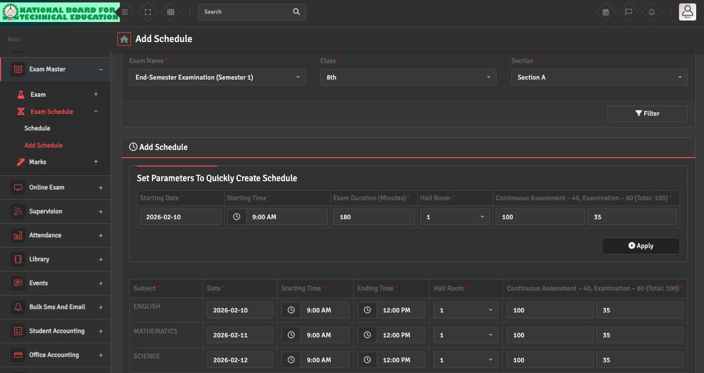 To define your date sheet, navigate to Exam Master → Exam Schedule → Add Schedule. Select the Exam and Class to assign dates, start times, durations, and room numbers for each subject.
