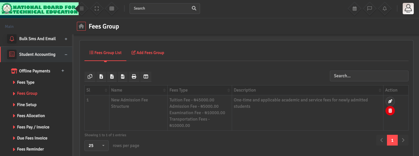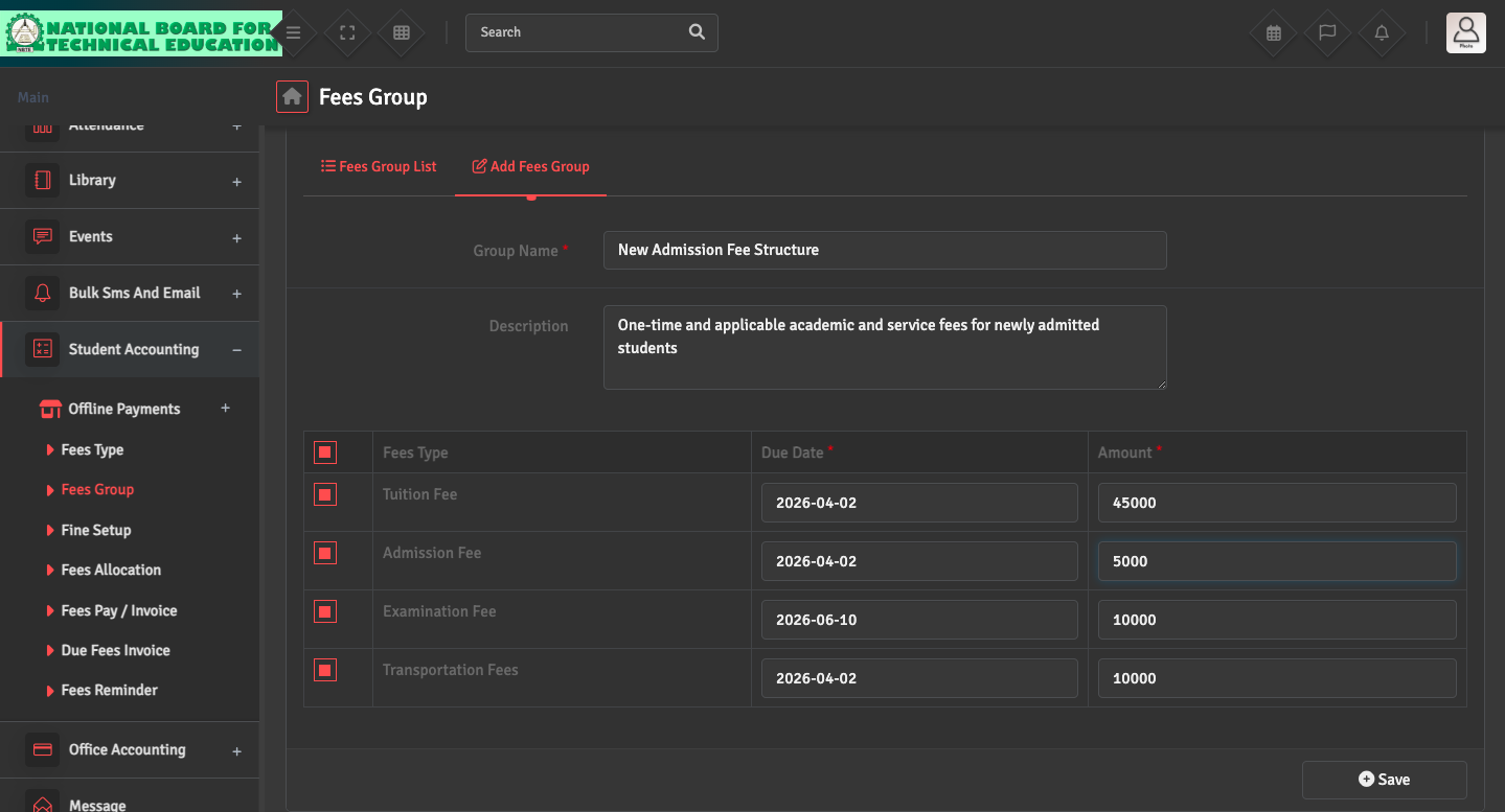 To bundle multiple fees together, go to Student Accounting → Fees Group → Add Fees Group. For example, you can create a 'New Admission Fees Structure' group that includes Tuition, Admission, Exam, and Transportation fees.