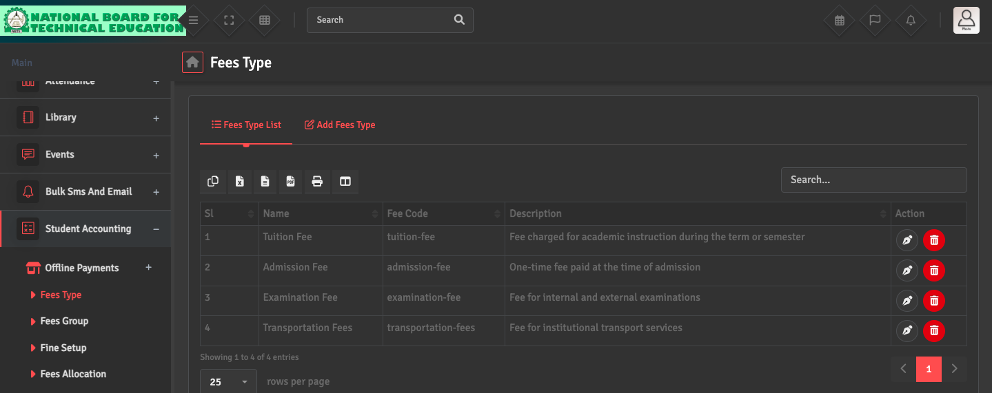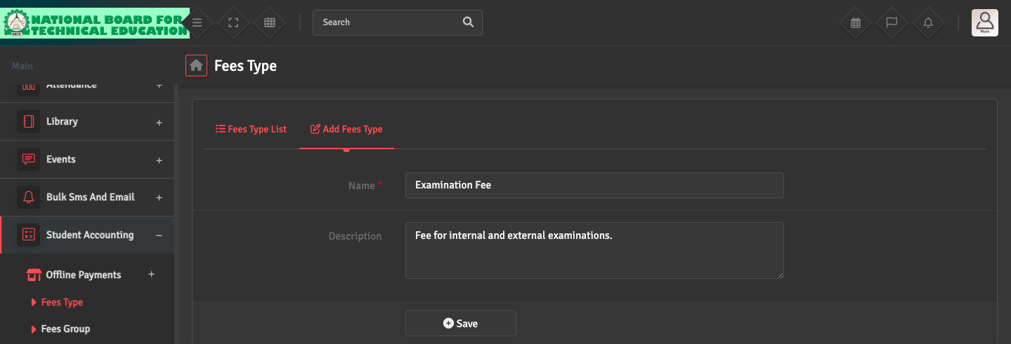 To define individual fee components, navigate to Student Accounting → Fees Type → Add Fees Type . Here, you can create specific categories such as 'Tuition Fee', 'Library Fee', or 'Transportation Fee' with description.