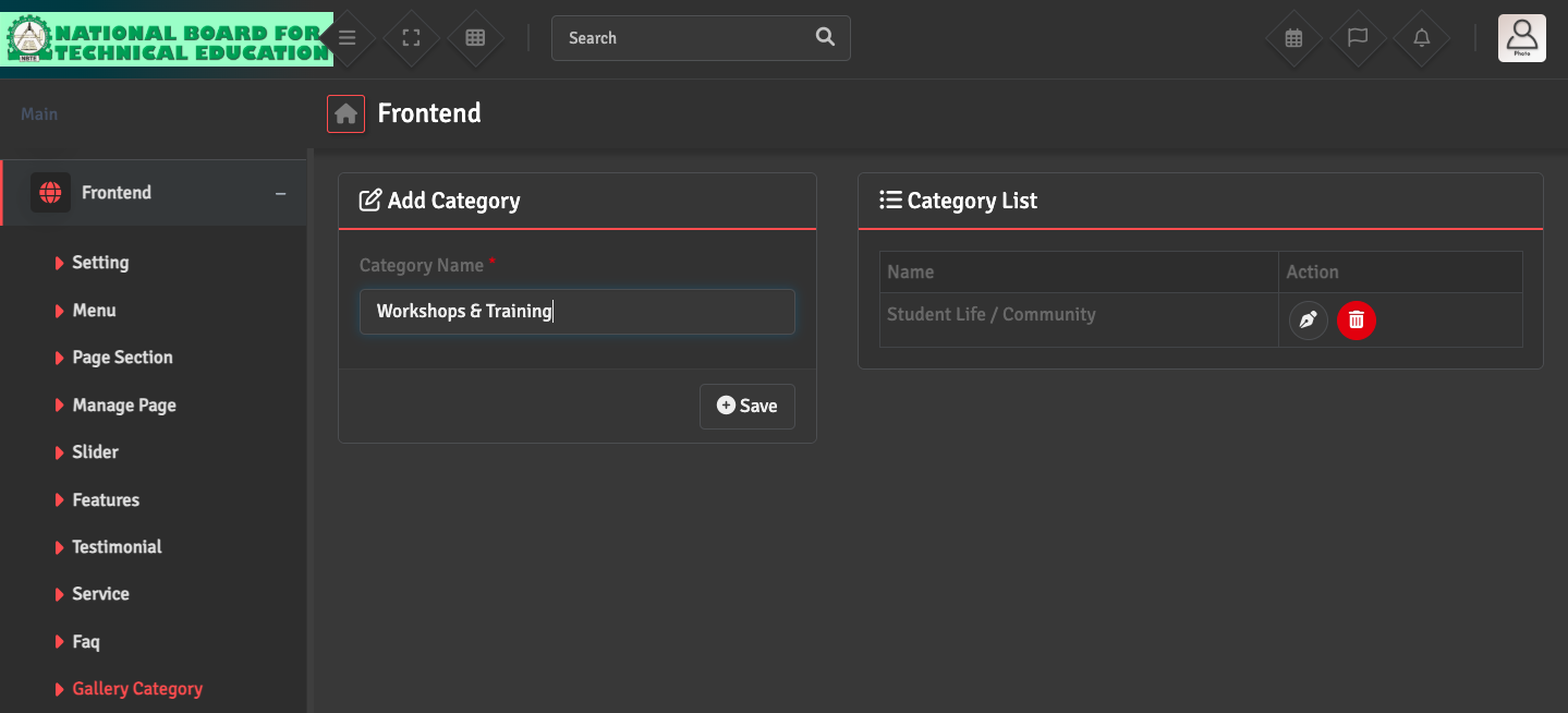 For Photos: First, navigate to Frontend → Gallery Category to create the appropriate category folders for your content.