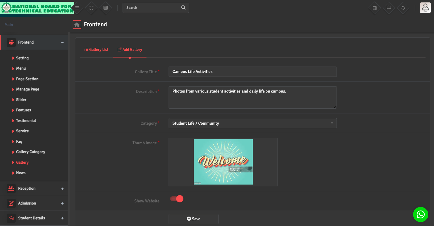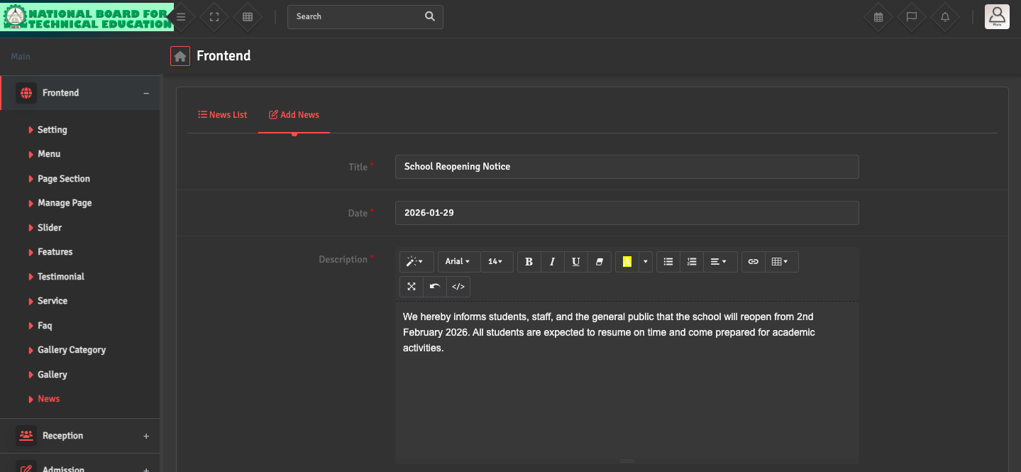 For Announcements: Navigate to Frontend → News → Add News. After entering the details, ensure the Show on Website option is toggled ON. If this is not selected, the post will remain as a draft and won't be visible to the public.