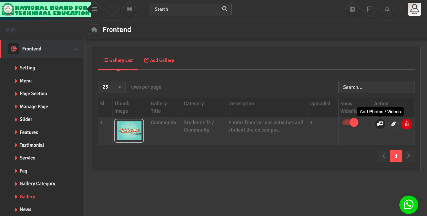 Go to the Gallery List and, under the Action section, click Add Photos/Videos. From there, you can upload photos or videos for the selected gallery category.