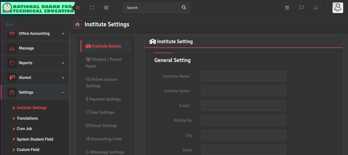 To update your institute's identity details, please navigate to Settings → Institute Settings → Institute Details. In this section, you can edit your institute’s official name, upload your school logo, and set your local timezone and currency.