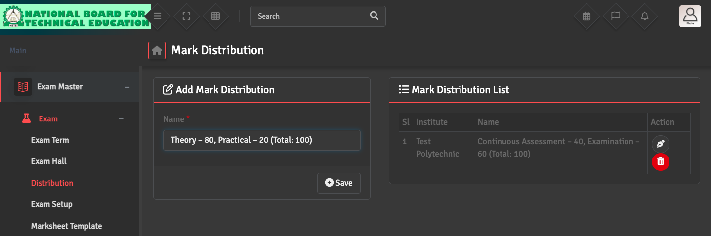 To define how a subject is graded, navigate to Exam Master → Exam → Distribution. Here, you can create categories such as 'Theory,' 'Practical,' 'Viva,' or 'Internal Assessment.'