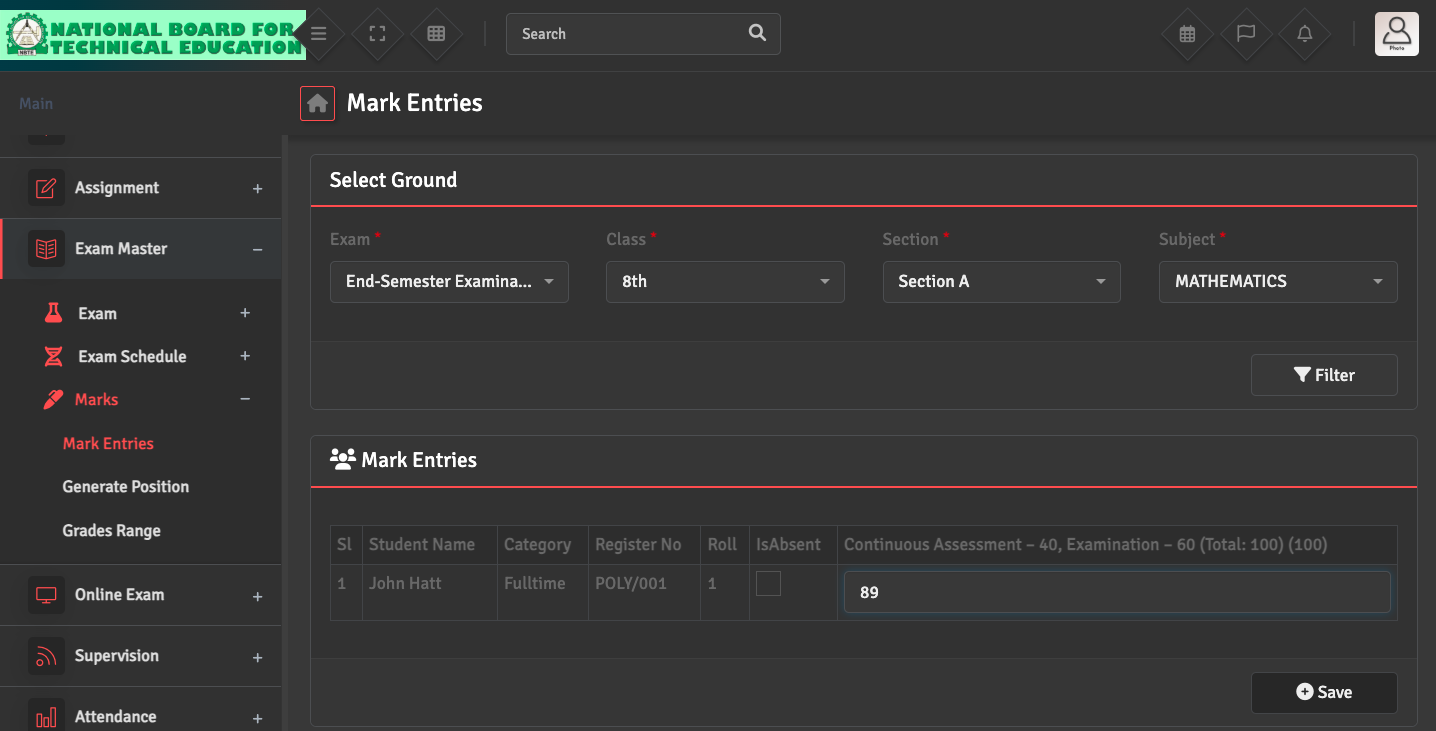 Please ensure the exam has an active mark distribution (eg: CA/Exams) mapped to it and that the grade range is properly configured. Navigate to Exam Master → Marks → Grade Range, and verify that valid percentage limits are defined.