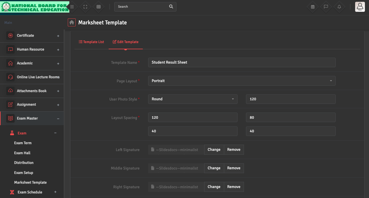 To modify the design of your report cards, please navigate to Exam Master → Exam → Marksheet Template. Here, you can toggle the visibility of specific elements such as the student’s photo, class rank, or teacher’s remarks.