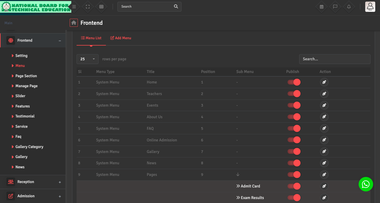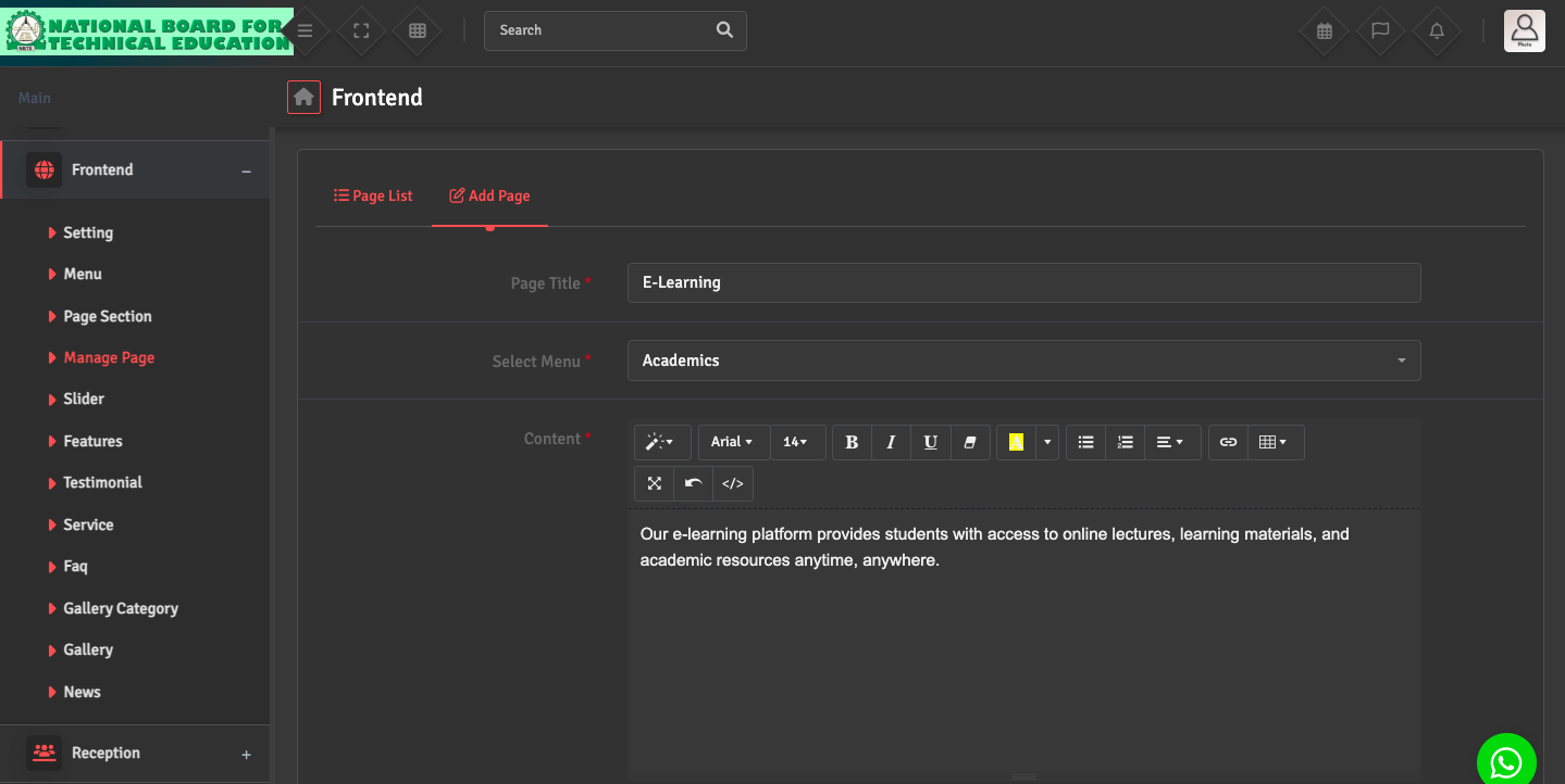 If a page is in the wrong menu or a menu link is broken, go to Frontend → Menu → Menu List to update or reorganize the menu. To add a new page to a menu, first create it under Frontend → Manage Page → Add Page.