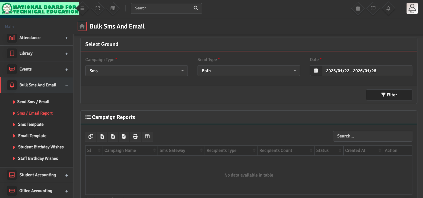 To track your SMS/ EMAIL sent, navigate to Bulk SMS/ Email → Email/SMS Report. This log provides a real-time status (Sent, Delivered, or Failed) for every sms/ email communication sent from the ERP.