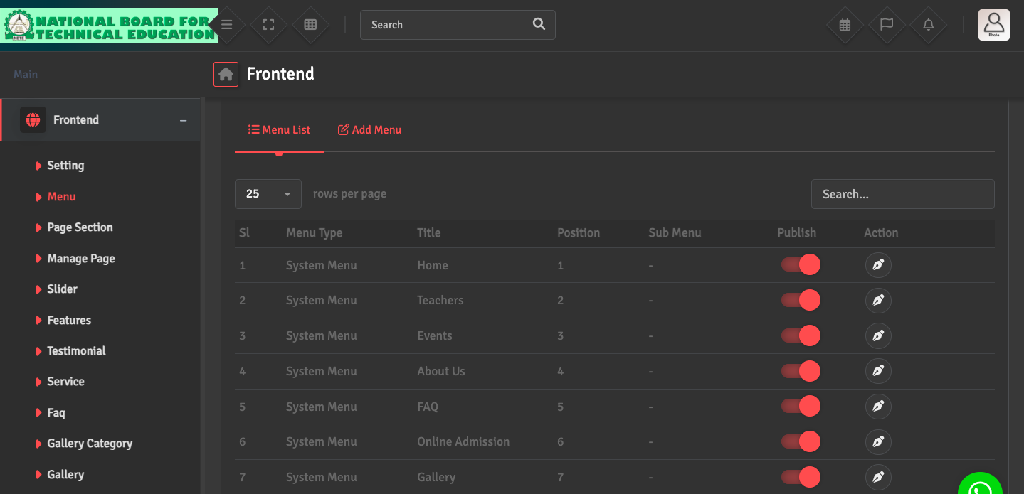 If the admission form is not appearing on your website, go to Frontend→ Menu. Verify that the Online Admission is set to Publish for the current academic session.