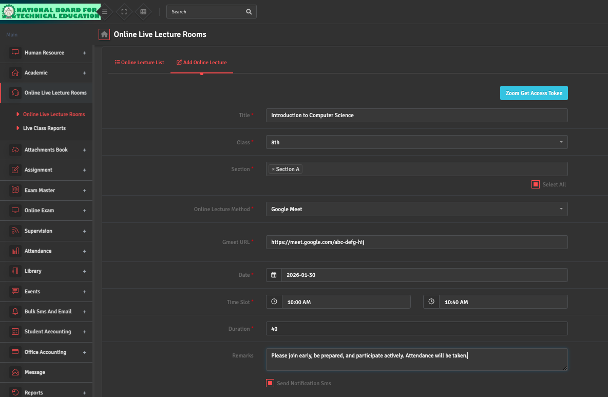 To host a virtual session, navigate to Online Live Lecture Rooms → Add Online Lecture. Select the Class, Section, Duration, and Date.