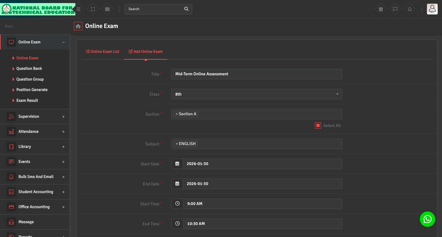 Select the class, section, and subject, then set the exam date, start time, and duration. Configure participation limits, marking and passing rules, exam and question type, and result settings.