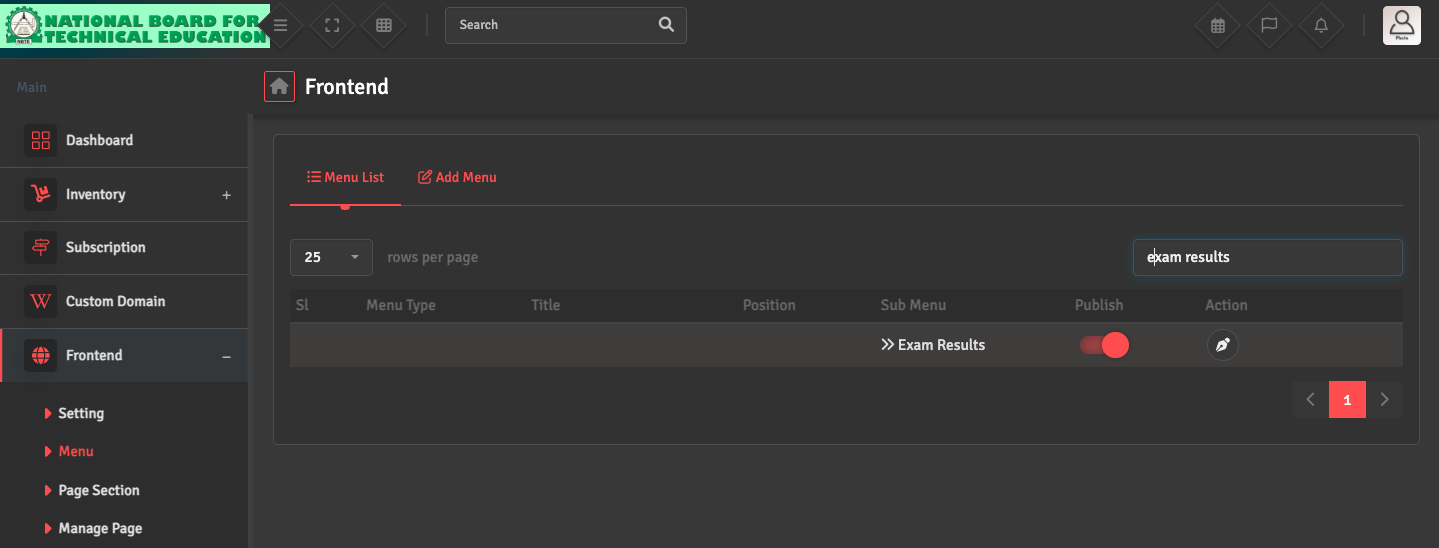 Additionally, go to Frontend → Menu → Menu List and search Exam Results to verify that the Result Menu is published.