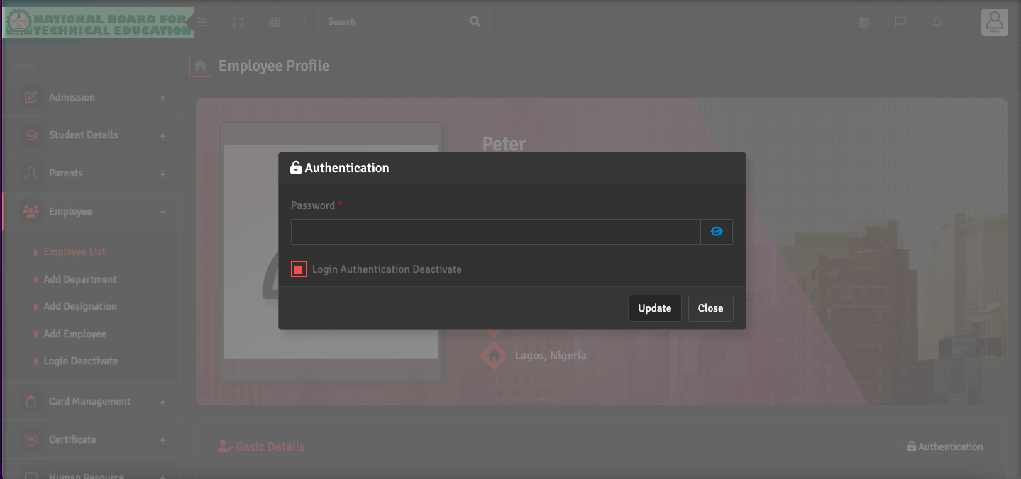 When an employee leaves the institute, go to Employee → Employee List, select the staff member, and click the 'Profile' button. On the right side of the Basic Details tab, click Authentication, then select Login Authentication Deactivate. Click Update.