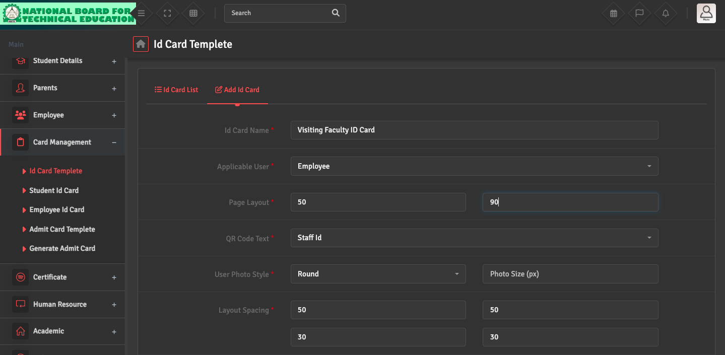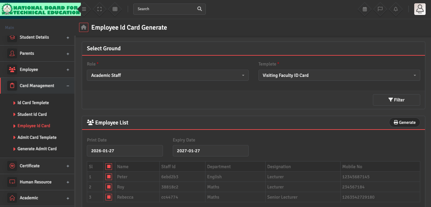 To generate ID cards for your employees, go to Card Management → Employee ID Card. You can filter the staff by 'Role' (e.g., Academic Staff, Admin). Select the staff from the given list and click Generate at the top right corner.
