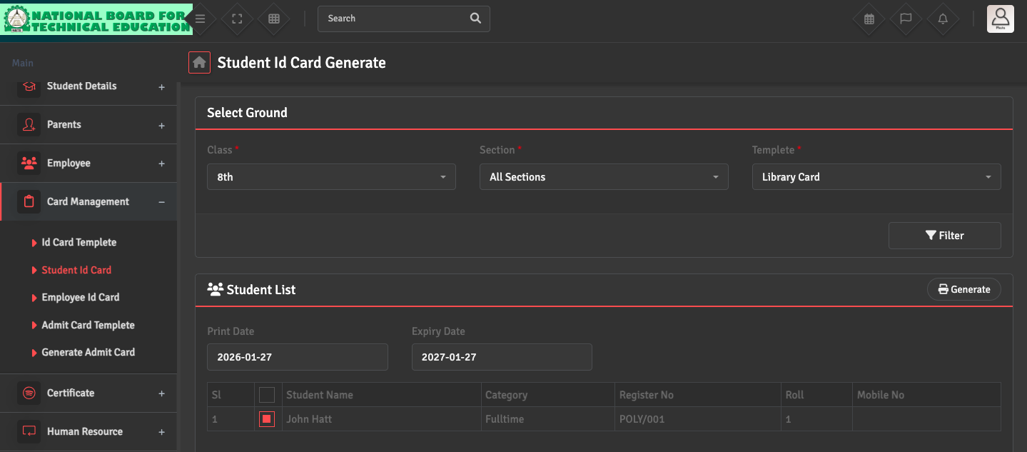 To print student IDs, navigate to Card Management → Student ID Card. Select the Class and Section, then choose your preferred template. Select the students from the given list and click Generate at the top right corner.
