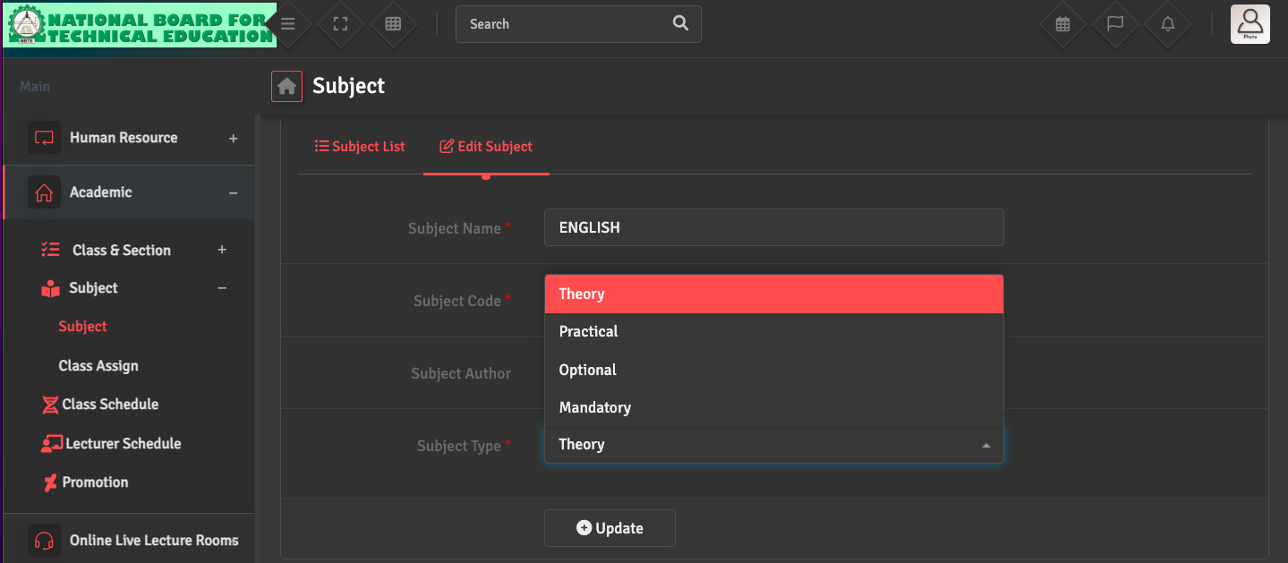If you need to update a subject type, go to Academics → Subject → Subject List and click 'Edit' under the Action section of the specific subject. You can then choose the correct 'Subject Type' from the dropdown menu to ensure accurate grading and scheduling.
