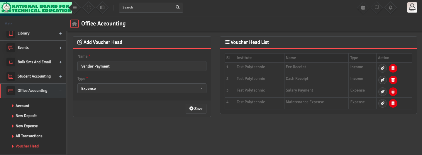 To categorize your transactions, navigate to Office Accounting → Voucher Head → Add Voucher Head. You can create specific heads for Income or Expense types.