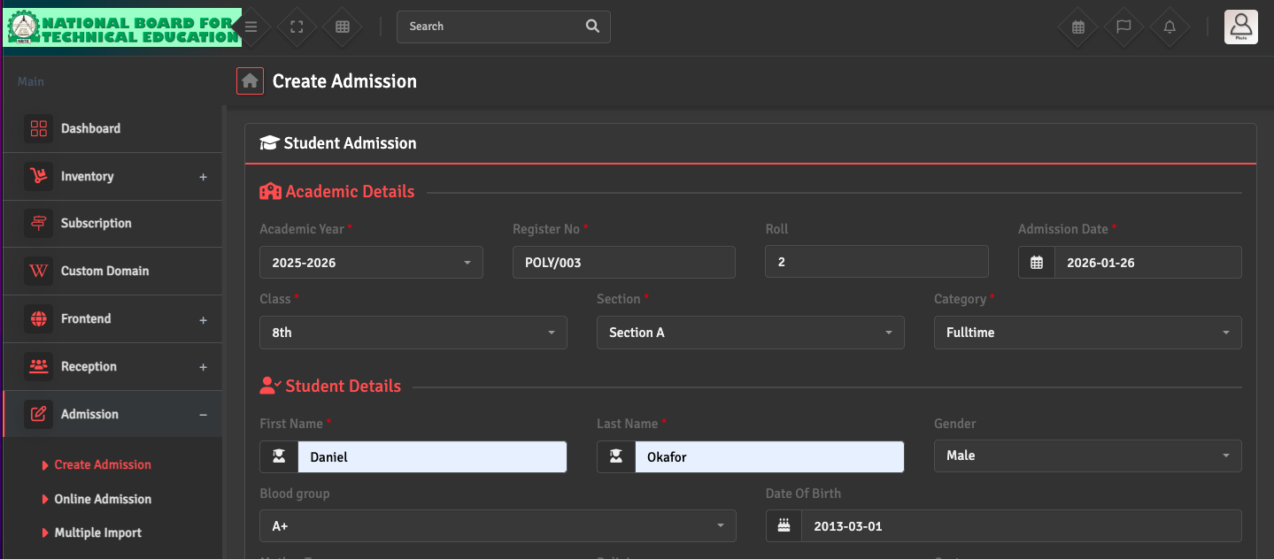 For students visiting the campus, please navigate to Admission→ Create Admission. Here, you can manually input the student's personal details, guardian information, and previous academic history.